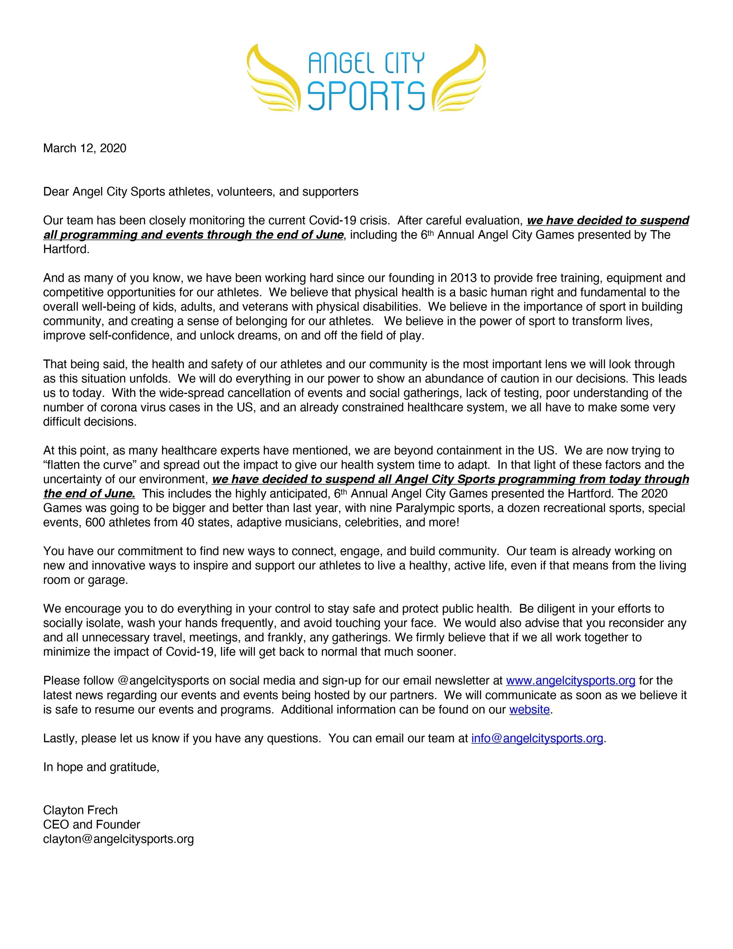 Angel City Sports is following protocol provided by the CDC. For additional information about COVID-19 and preventative measures you can take please visit the CDC Website!